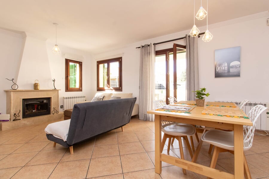 Denna attraktiva fastighet med pool, generösa terrasser och lummig trädgård är belägen i Porreres – en charmig by i öns sydcentrala del. Här bor du i genuina omgivningar med närhet till det bästa Mallorca har att erbjuda. Fastigheten har dessutom uthyrningslicens för sex personer, vilket gör den till en mycket intressant investeringsmöjlighet. Med en total yta om cirka 334 m², varav 137 m² utgörs av terrasser och utomhusytor, erbjuds gott om plats för både avkoppling och sociala tillställningar. Entréplanet välkomnar med en rymlig hall som leder vidare till ett ljust vardagsrum och matsal med öppen spis, fullt utrustat kök med tvättstuga, ett sovrum med dubbelsäng samt ett badrum med dusch. På övre plan finns ytterligare ett sovrum med dubbelsäng, ett sällskapsrum eller kontorsdel, ett badrum med badkar samt ett elegant master bedroom med klädkammare, eget badrum med dusch och privat terrass. Den stora höjdpunkten är den inbjudande utomhusmiljön – en privat oas med pool, solterrasser och grillplats, perfekt för långa middagar under bar himmel och avkoppling året runt i fullständig avskildhet. En rymlig och välplanerad bostad som kombinerar komfort, charm och investeringspotential – endast cirka 20 minuter från Palma.